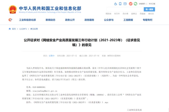 7月12日,工业和信息化部发布的《网络安全产业高质量发展三年行动计划(2021-2023年)(征求意见稿)》(以下简称“意见稿”)指出,到2023年,网络安全技术创新能力明显提高,产品和服务水平不断提升,经济社会网络安全需求加快释放,产融合作精准高效,网络安全人才队伍日益壮大,产业基础能力和综合实力持续增强,产业结构布局更加优化,产业发展生态健康有序。